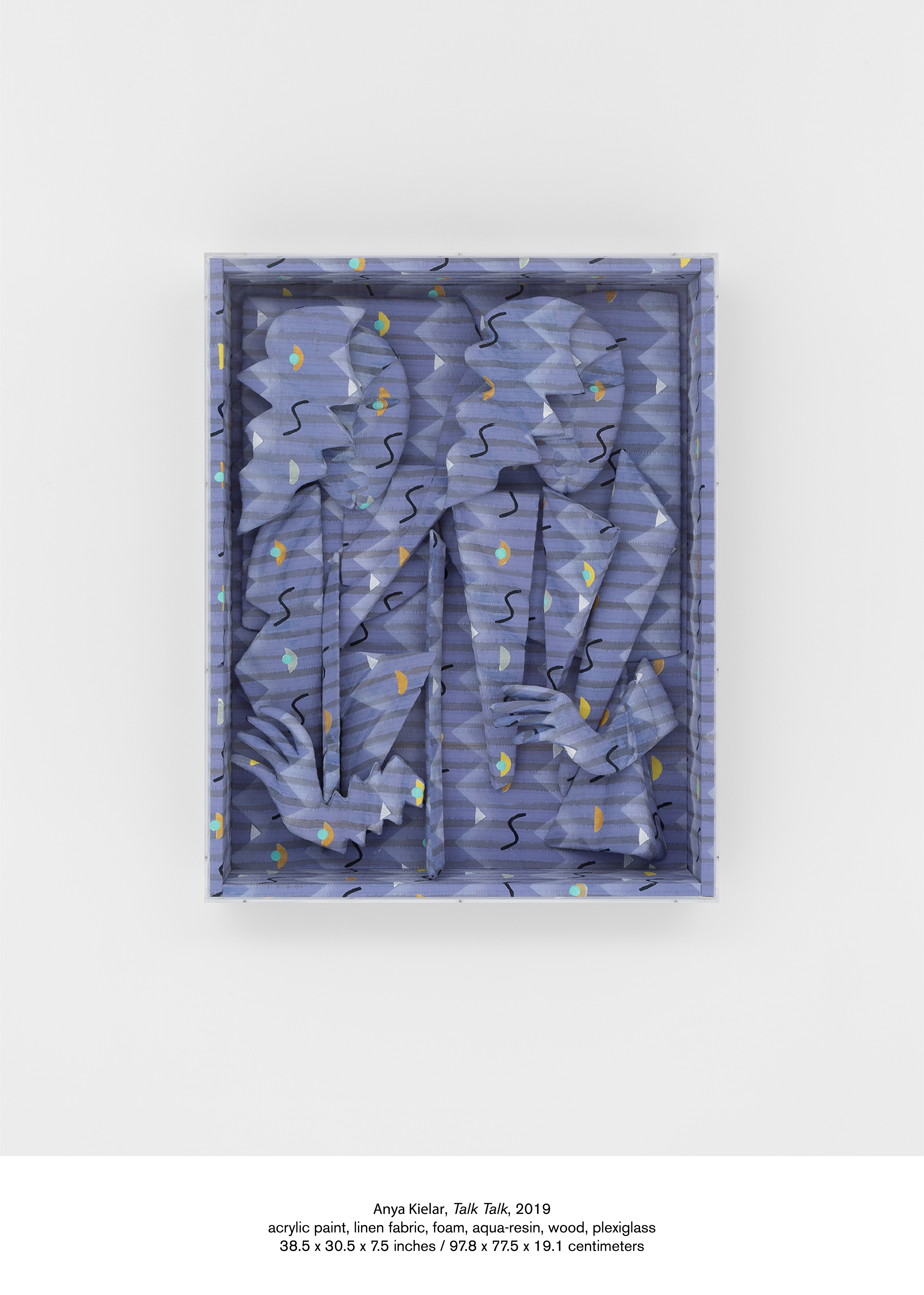 Anya Kielar (born 1978; New York, NY) lives and works in Brooklyn, NY. She holds an MFA from Columbia University, New York, NY, and a BFA from The Cooper Union, New York, NY. Recent exhibitions include: Cursives, Marinaro Gallery, New York, NY; NADA House Governors Island, New York, NY; Ten Years, Rachel Uffner Gallery, New York, NY.