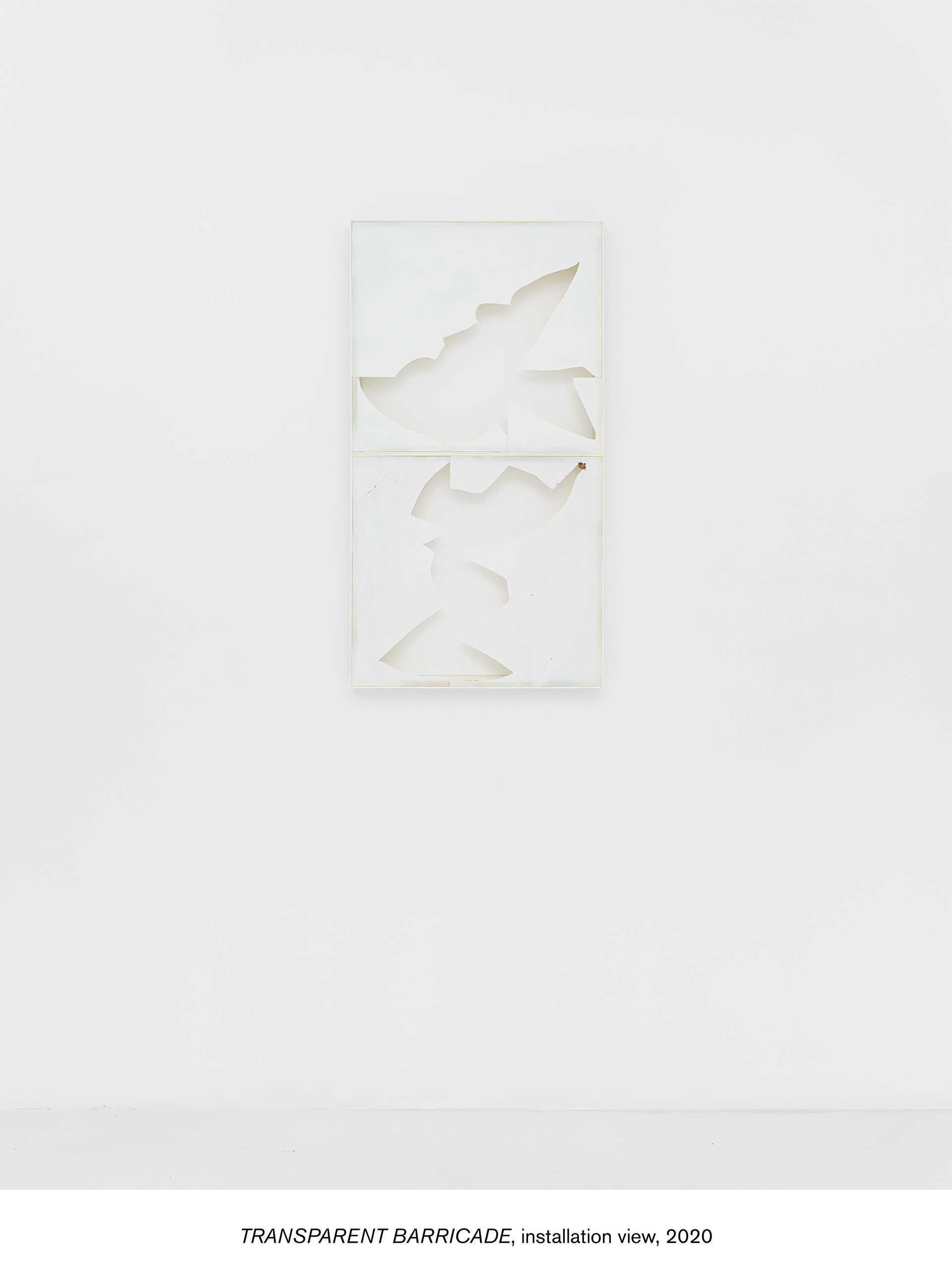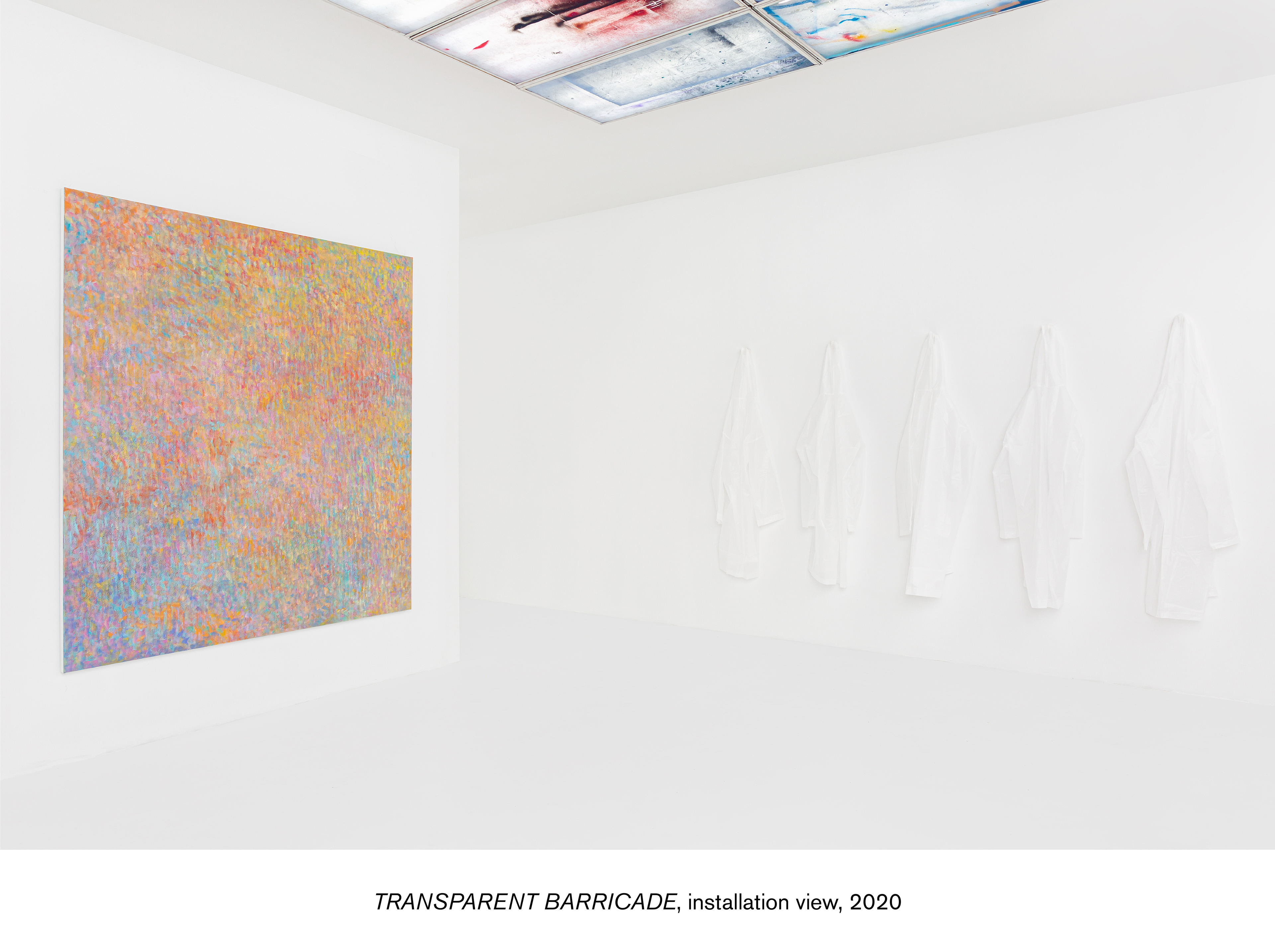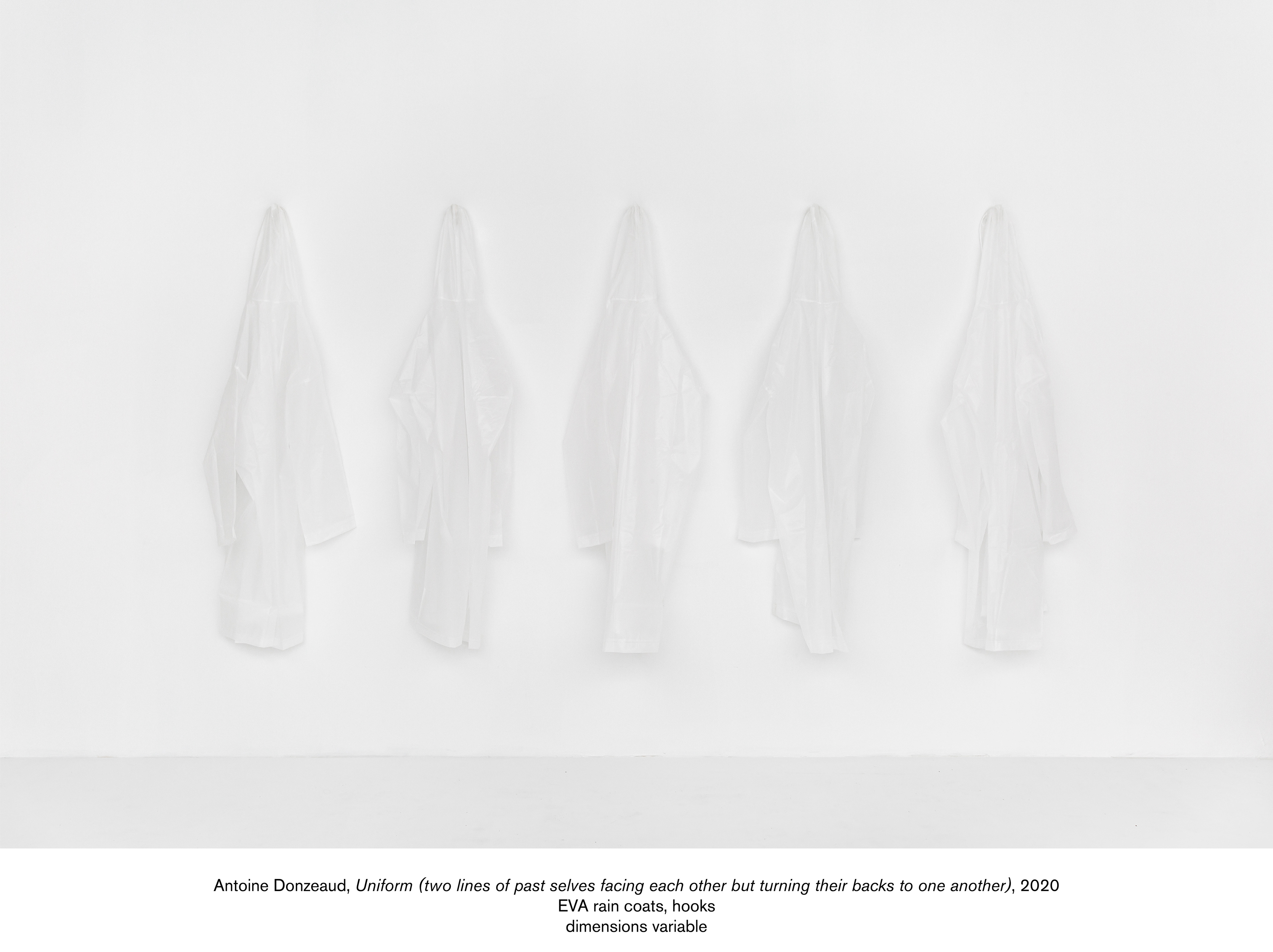 Donzeaud also riffs off of the window in a series of works made by painting panes of glass that he then breaks, leaving a jagged outline. These works evoke a darker element of the window motif by suggesting criminology’s broken window theory, which proposes that evidence of criminality, such as broken windows, is likely to generate further criminality. This was also a reference for Gordon Matta-Clark in his controversial Window Blow-Out (1976), where he shot out the windows of the Institute for Architecture and Urban Studies' Midtown Manhattan exhibition space, evoking the problematic application of this theory to smashed windows in depressed minority neighborhoods in The Bronx. Donzeaud extends the architectural reference to other works in the exhibition, framing the gallery’s lighting system with vinyl panels that incorporate the overspray from the process of making the Broken Windows works, as well as other studio debris. A series of translucent rain jackets extend this investigation to the site of the body, also suggesting a bodily referent for the off-white of the Broken Windows works.